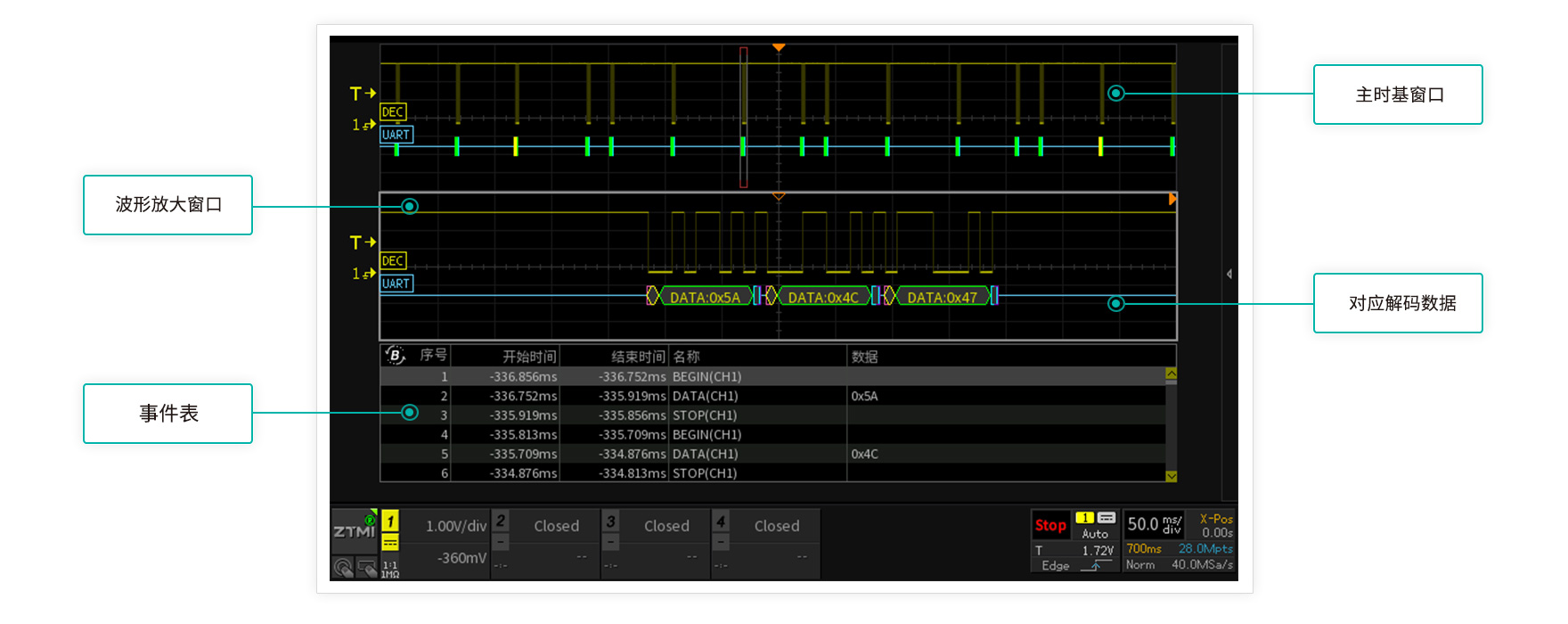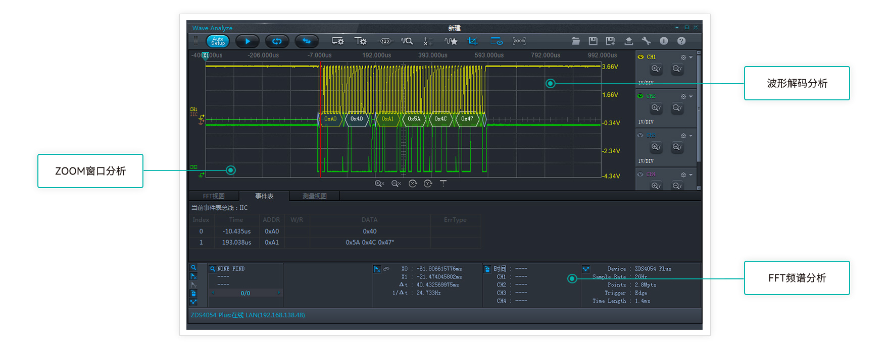 波形刷新率越高,死區時間就越短。ZDS4000系列示波器,標配1M次波形刷新率,配合模板觸發,讓您最大概率的發現并捕獲異常信號。