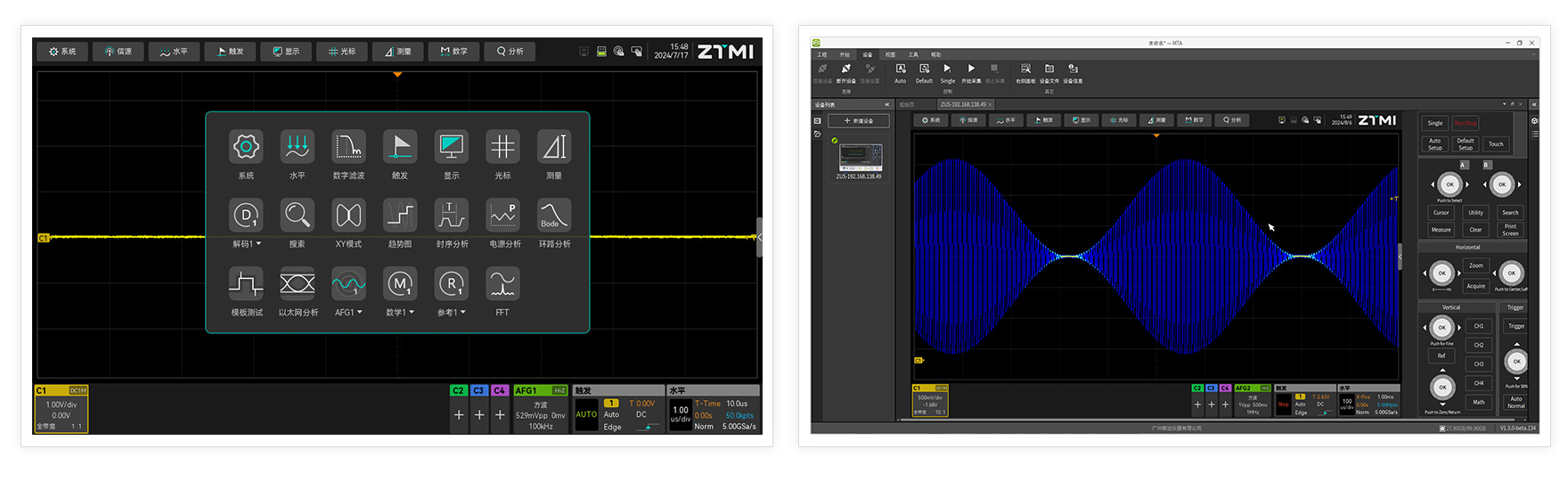 ZUS5000示波器內置FIR硬件實時濾波器,可在10Hz-500MHz范圍內任意調節示波器帶寬,精準過濾特定頻點的噪聲與干擾信號,用更專業的手段讓工程師看到更真實的波形信號。