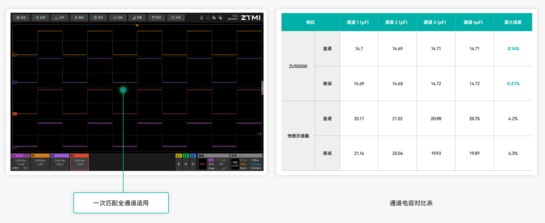 示波器探頭接入示波器通道需要進行電容匹配,傳統示波器通道電容一致性差,探頭連接不同通道(甚至不同垂直檔位)都需要匹配電容。ZUS5000 采用全新電路結構,保證通道間電容一致性,用戶匹配一次探頭即可全通道、全檔位使用。
