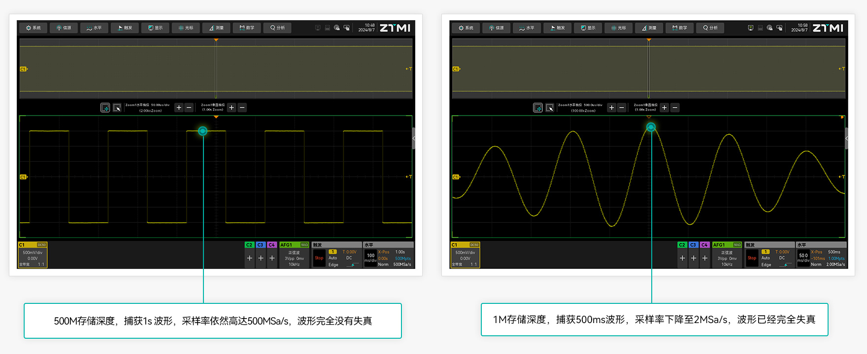 500Mpts存儲深度,捕獲長時間波形不失真