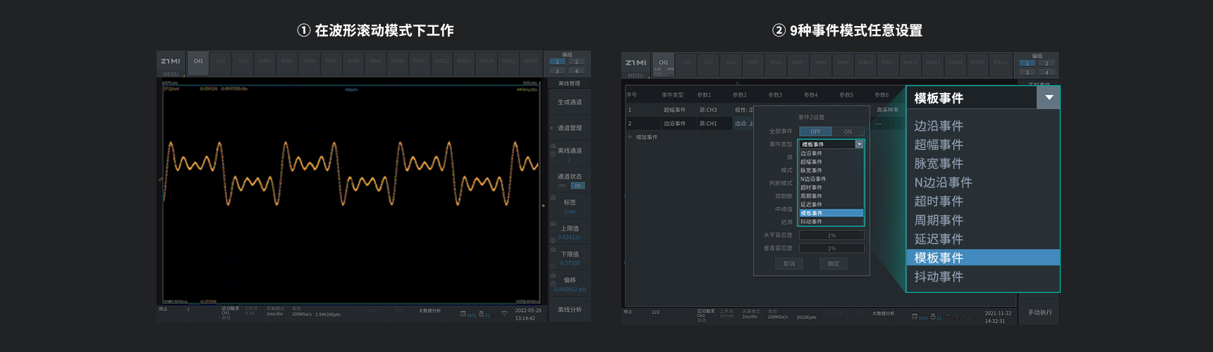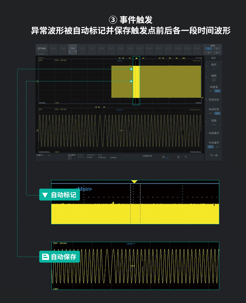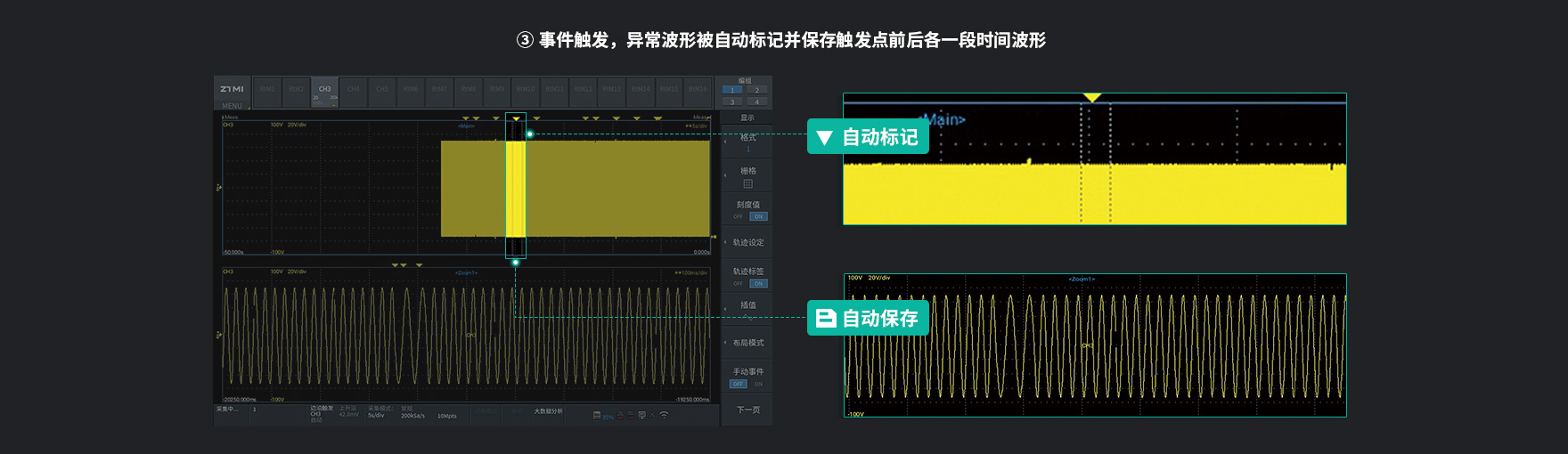 實時事件是ZDL6000示波記錄儀最先進的功能,這是一種可以使示波記錄儀運行在波形滾動模式下無死區(qū)地對波形進行實時條件判定的功能,當(dāng)滿足觸發(fā)條件時,可對觸發(fā)點前后各一段波形進行數(shù)據(jù)存儲,大大節(jié)省存儲空間和查找異常波形的時間。